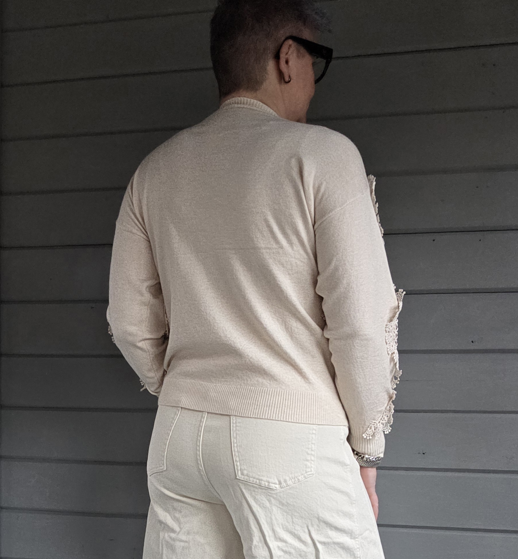 Trui heeft voor en op de mouwen als eyecatcher kant