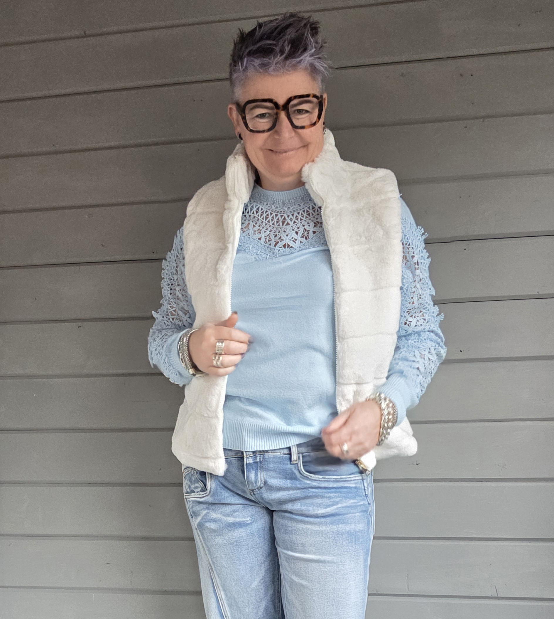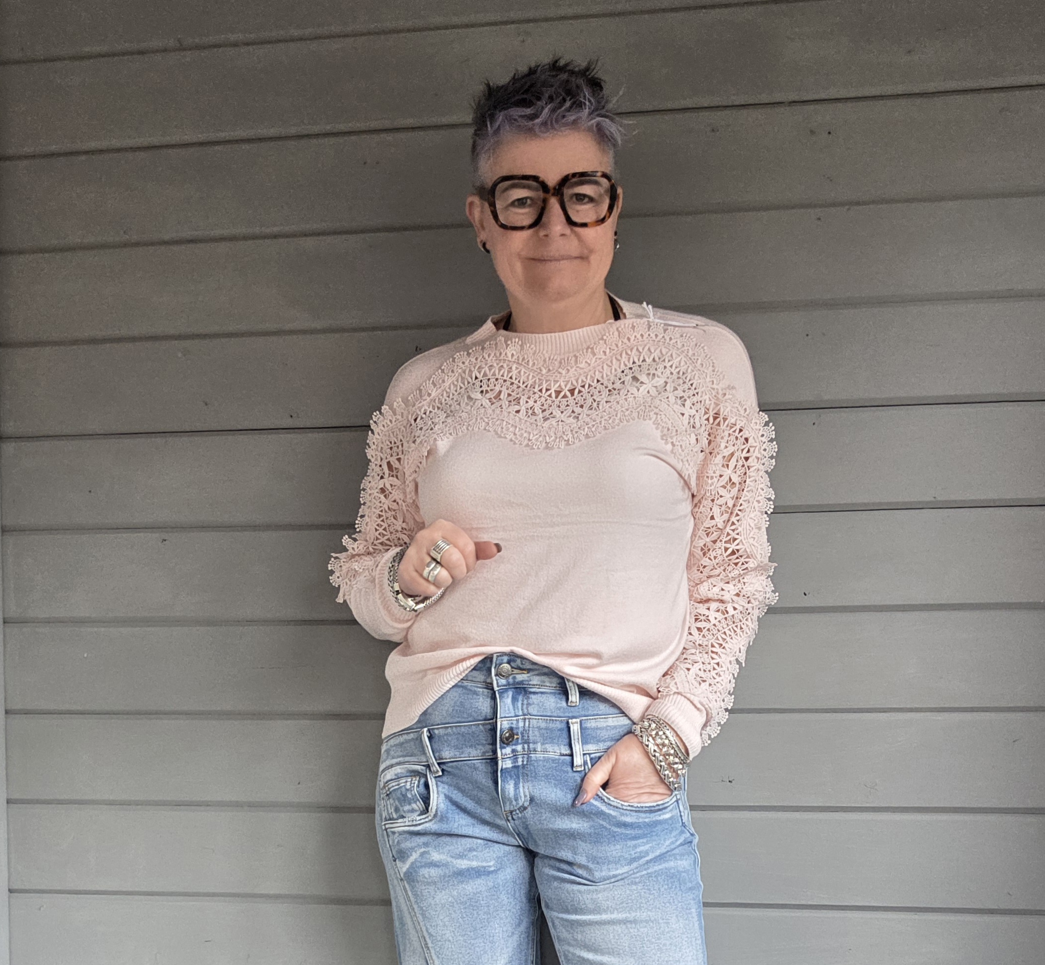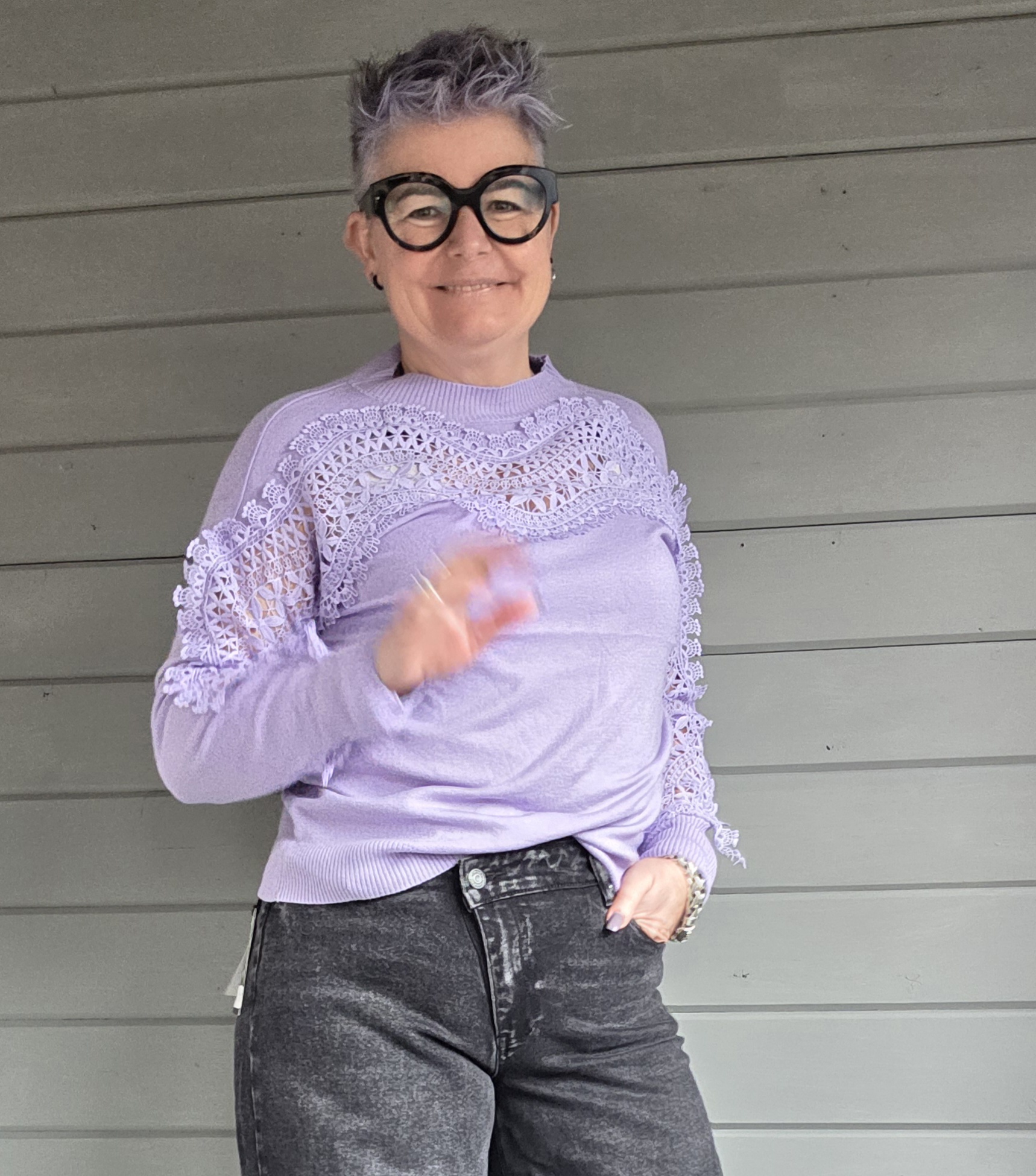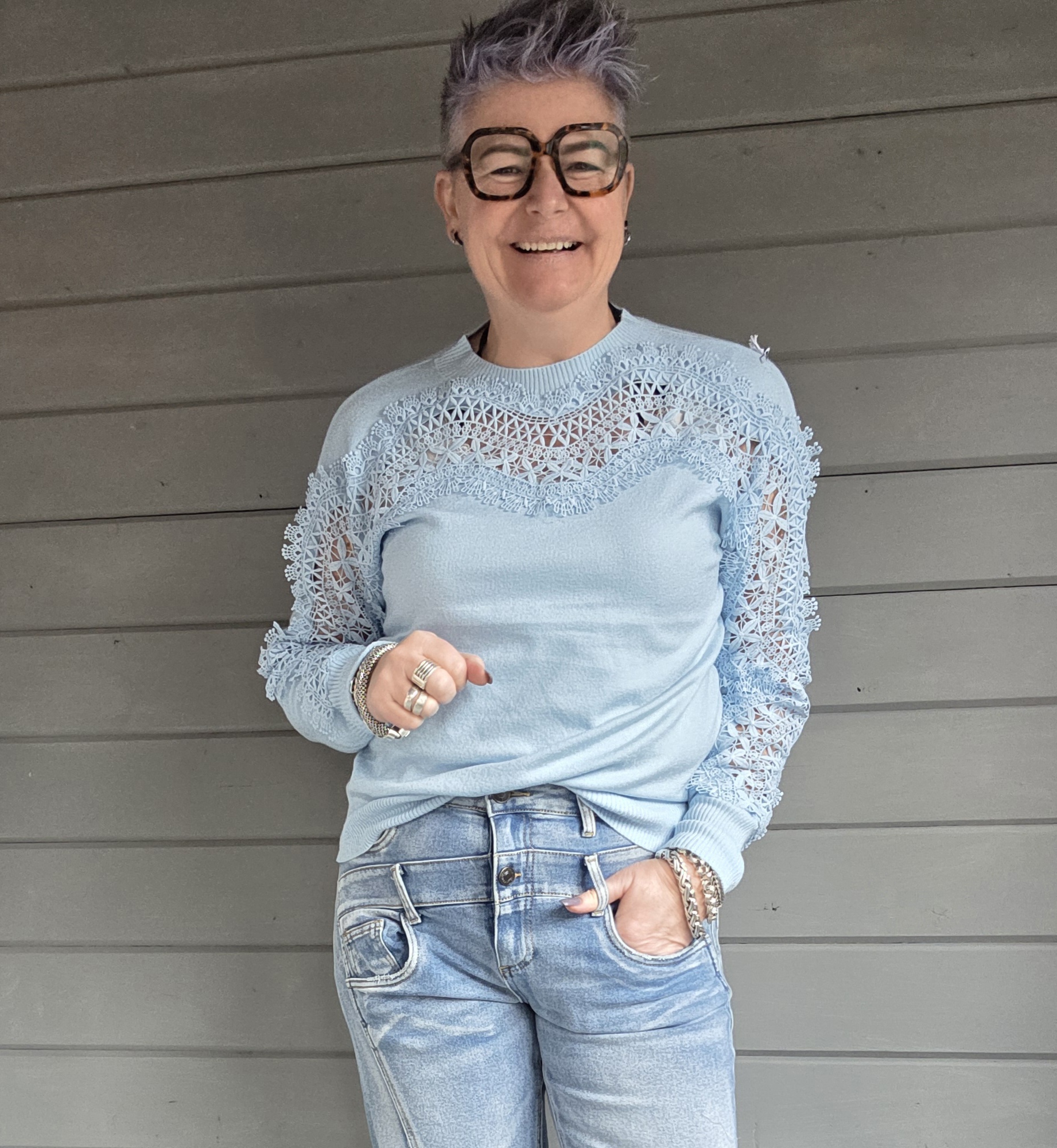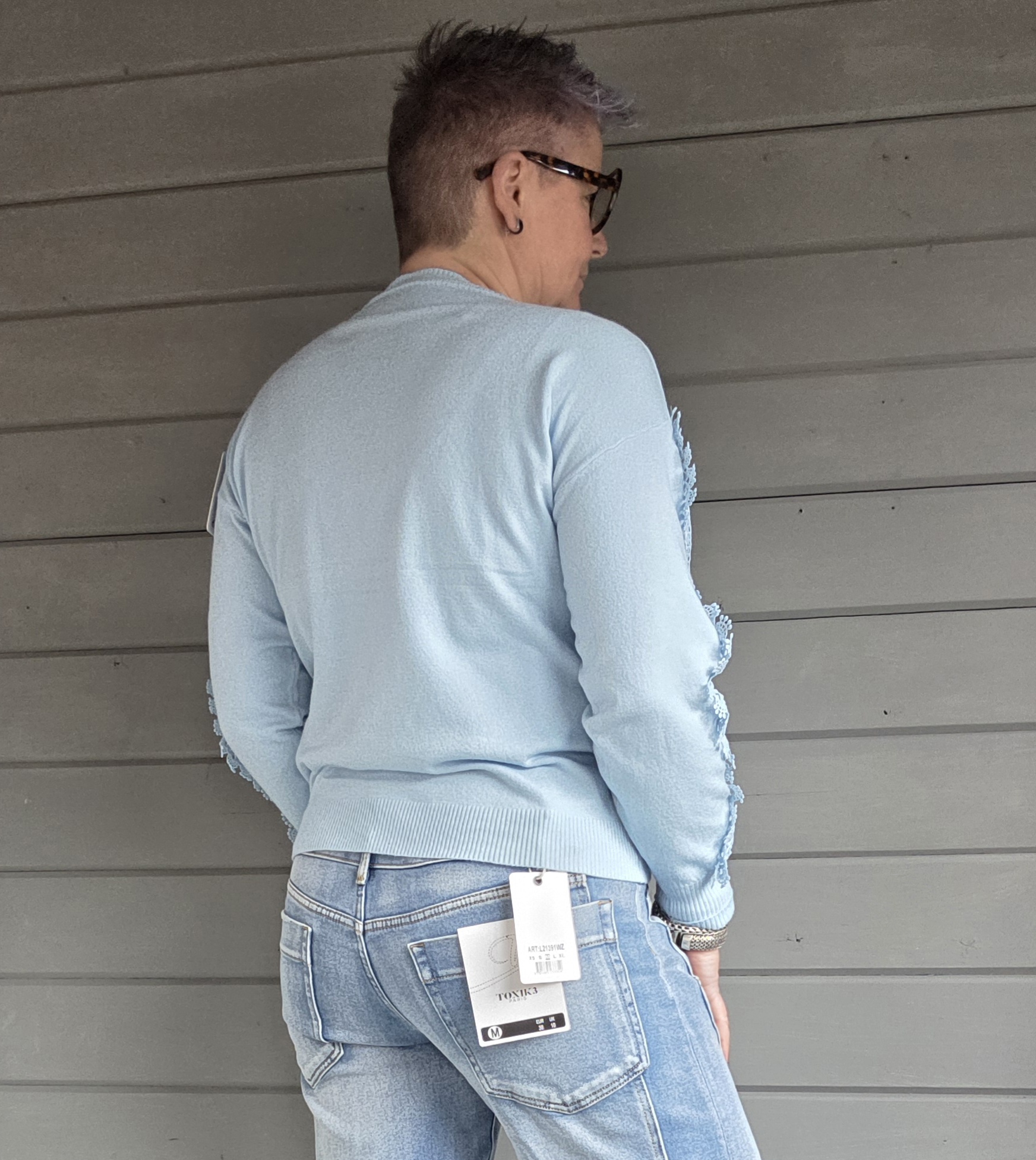 Trui heeft voor en op de mouwen als eyecatcher kant