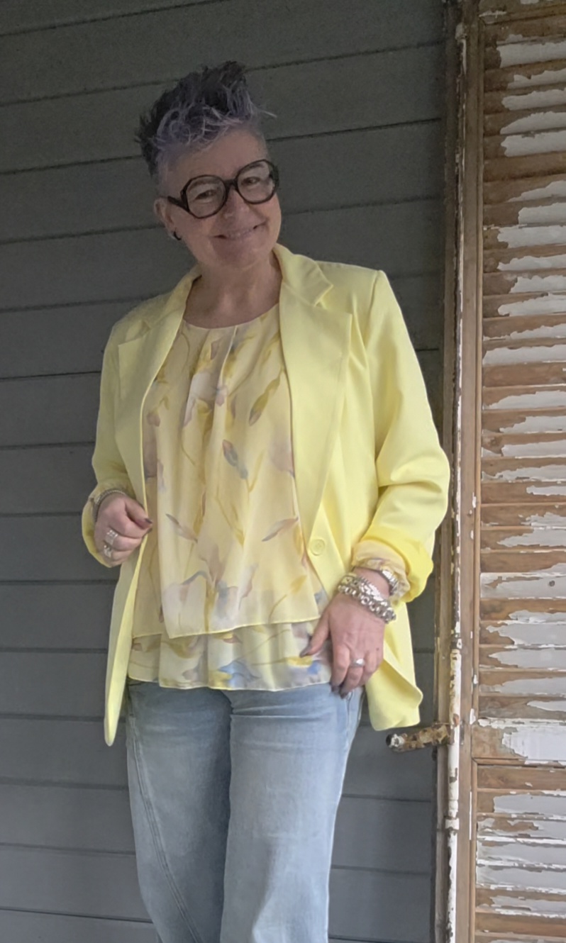 Daar kun je allerlei kleuren broekjes onder dragen en is t wat frisser geldt dat ook voor vest/blazer erover heen