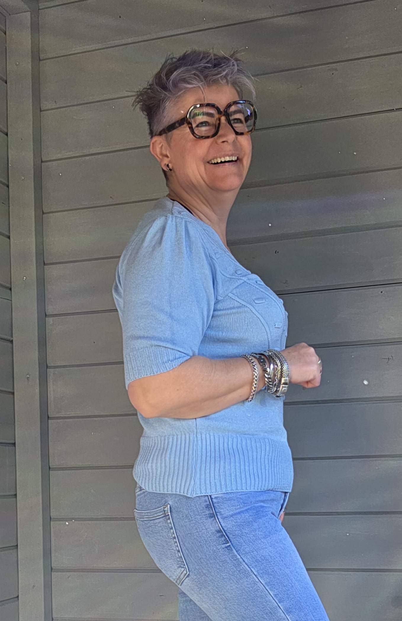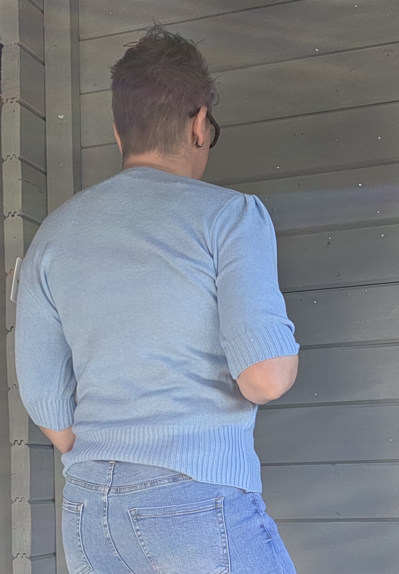Pofmouwtje en aan de voorkant een ingebreid patroon, zo is het net niet effen.