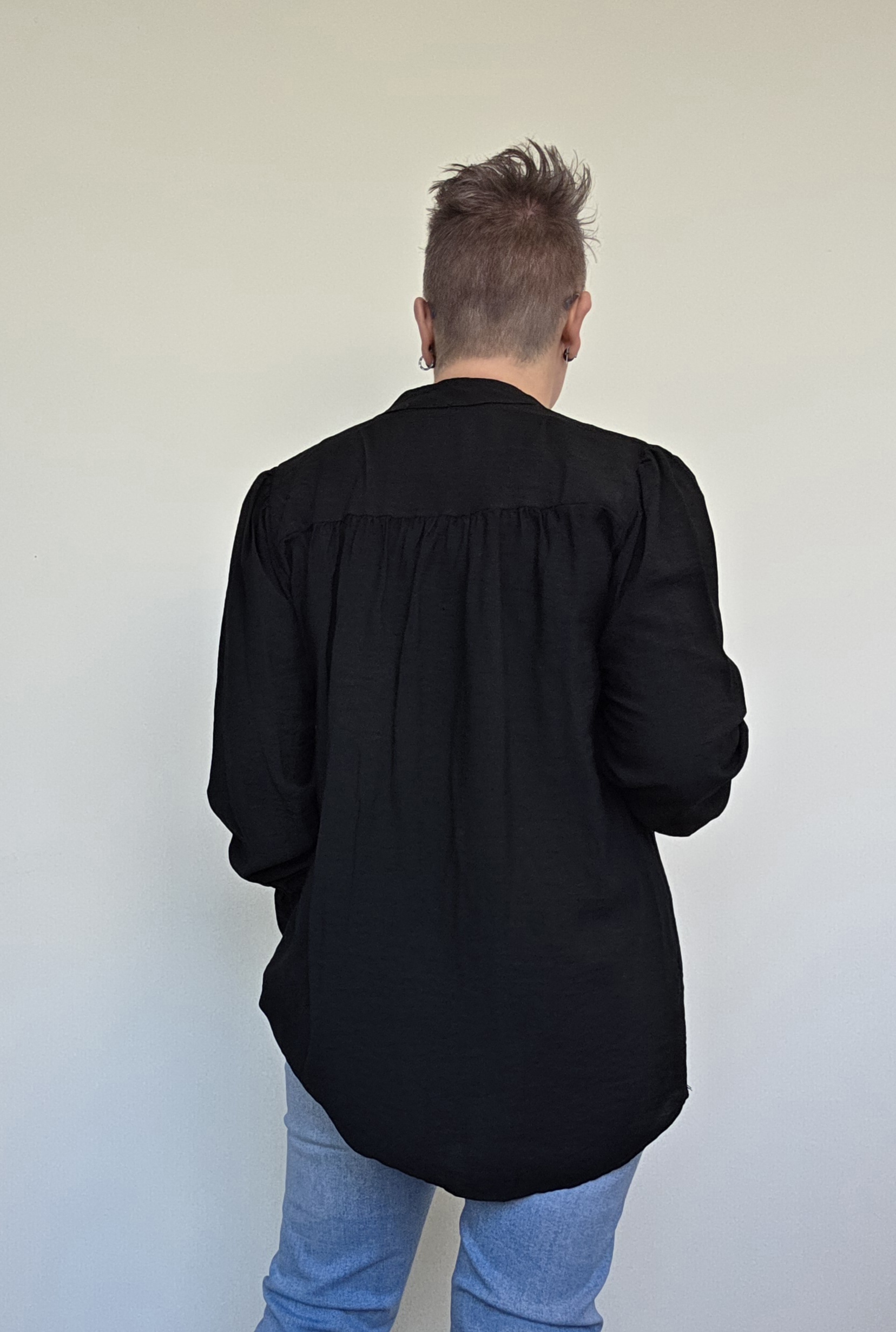 Shirt heeft een opstaand boordje , leuk pofmouwtje, elastiek onderaan de mouw, zodat deze goed omhoog blijft zitten als je dat wilt.