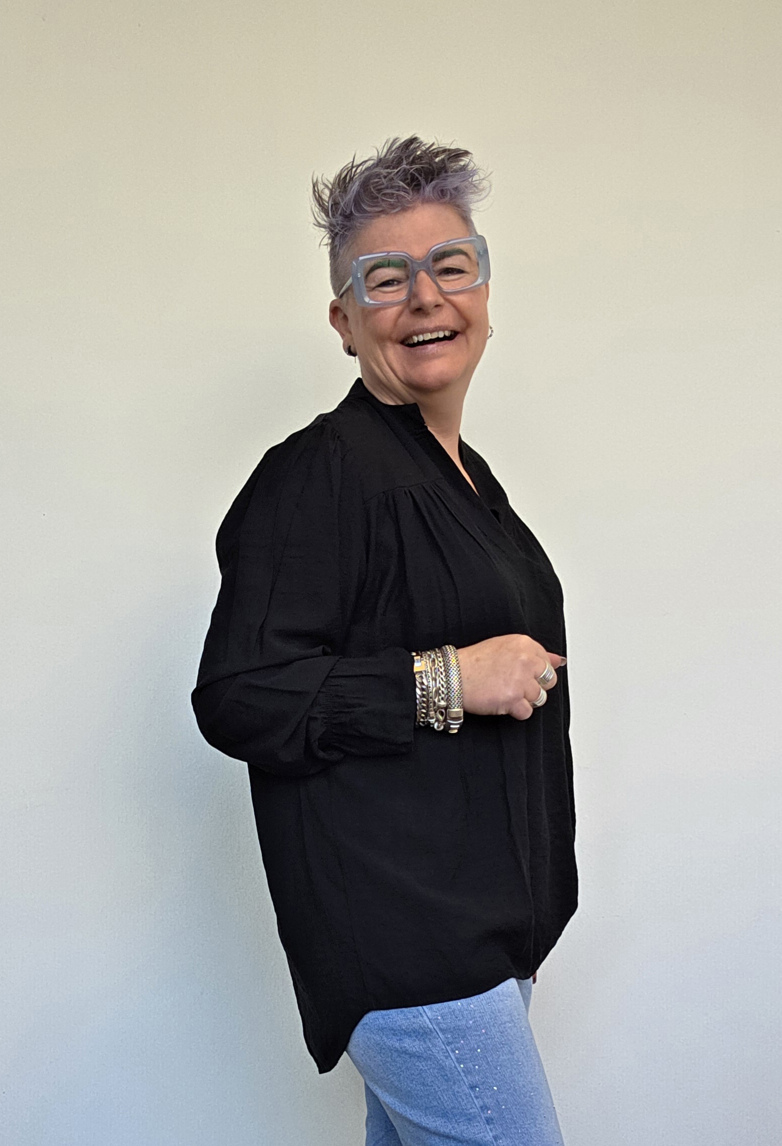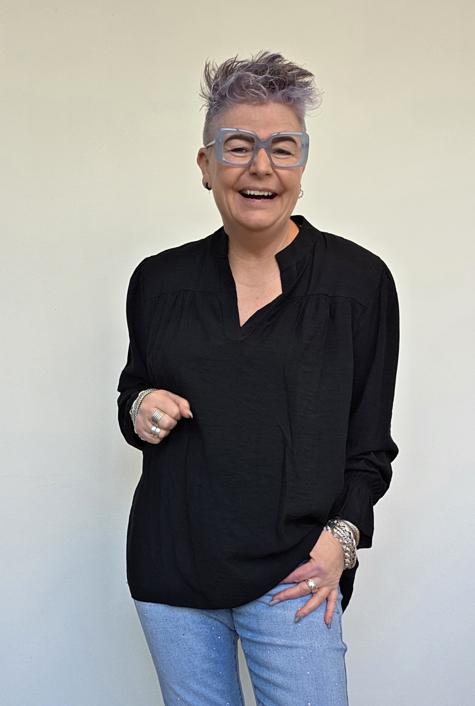 Fijne basic, onder een vest/blazer. Maar ook lekker om zo aan te schieten en je bent klaar. Door de stof draag je deze ook in de zomer door.