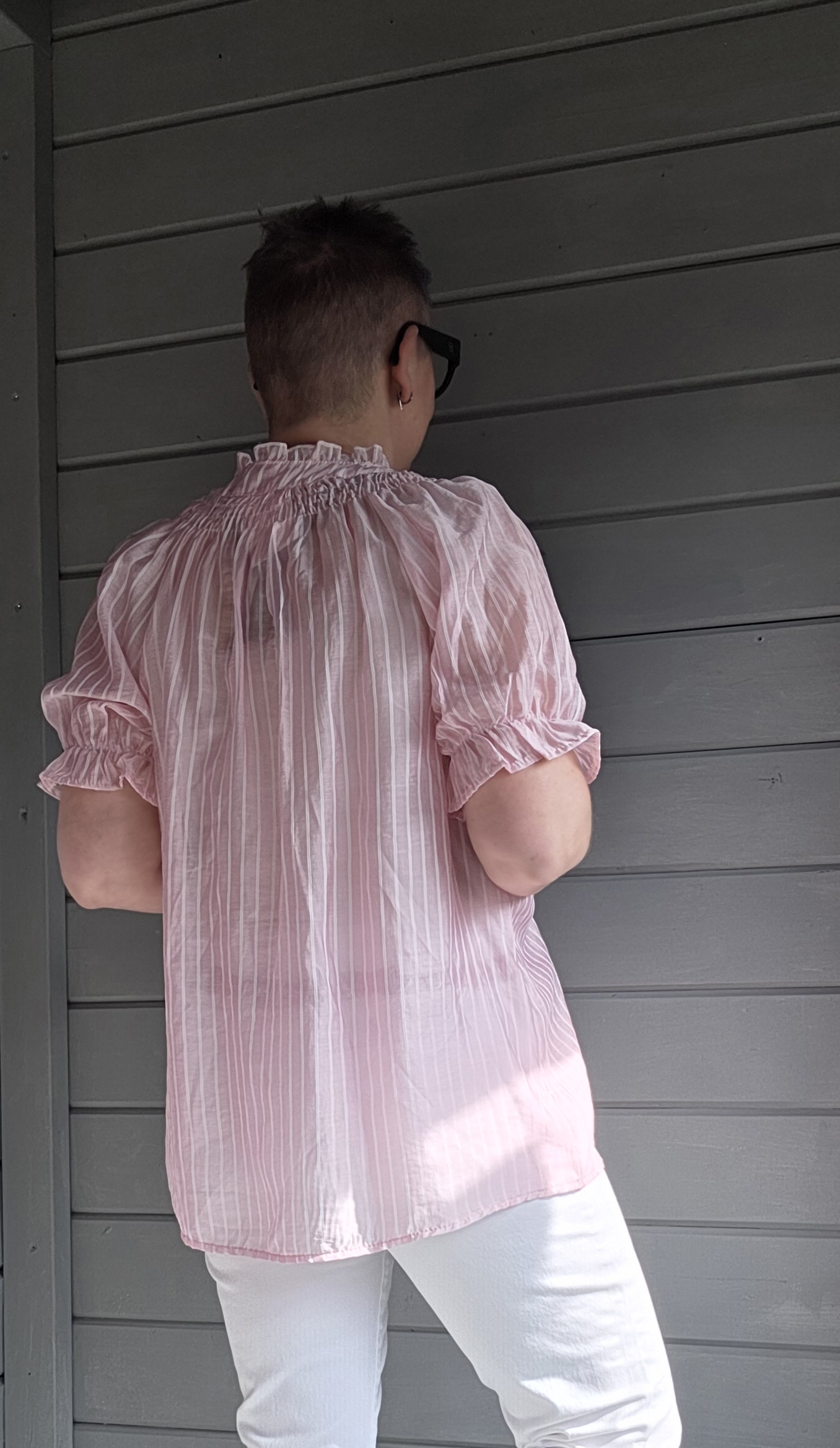 Shirt heeft drie knoopjes bij hals. En opstaand boordje.