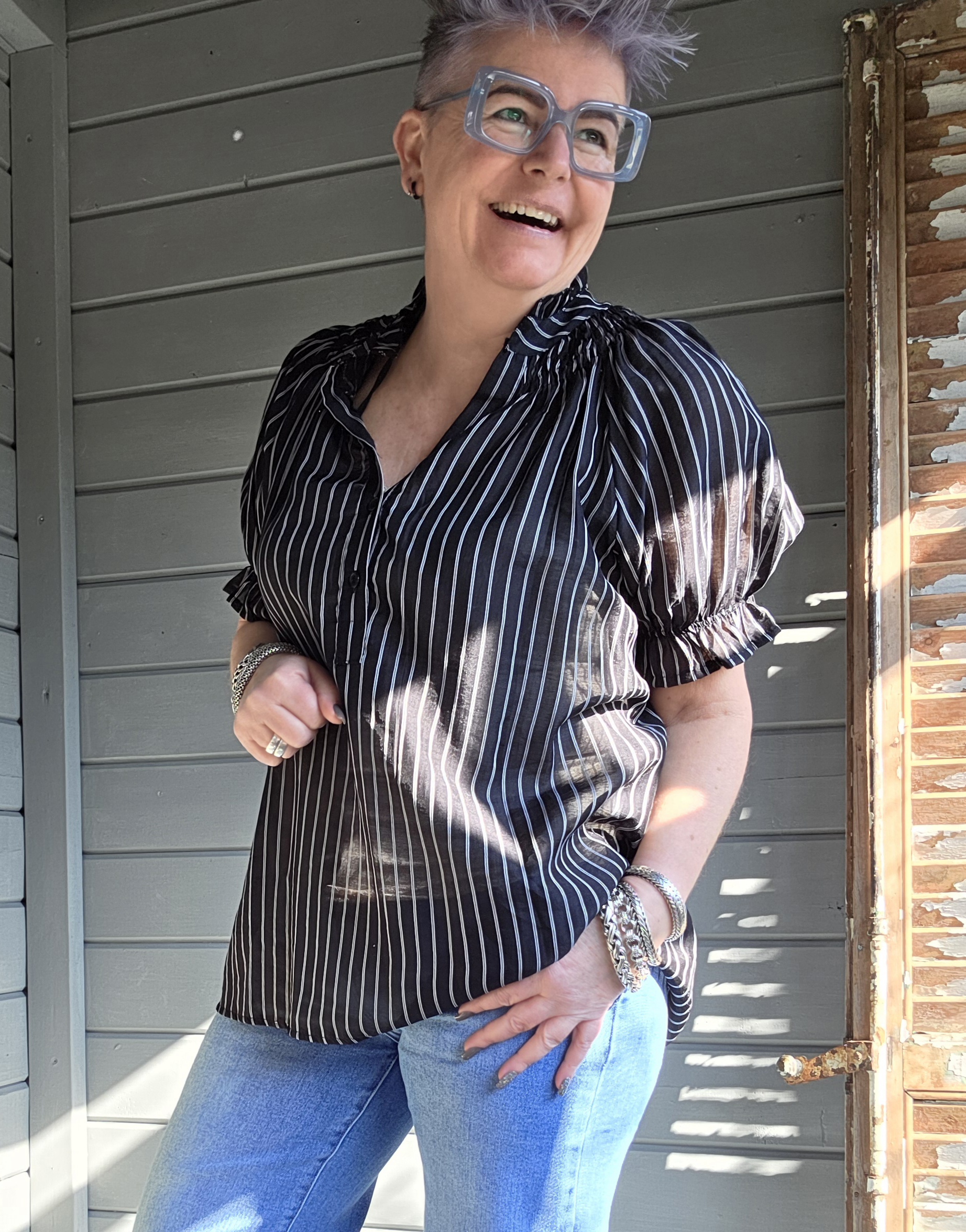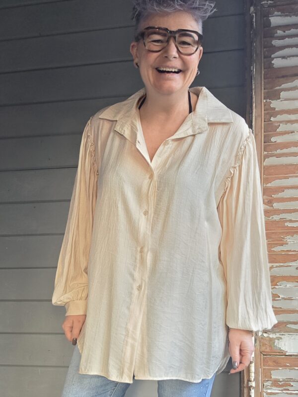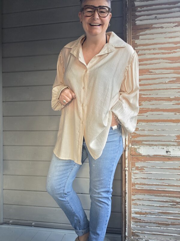 Shirt heeft een strik, die je ook los kunt trekken en dan als stropje dragen.