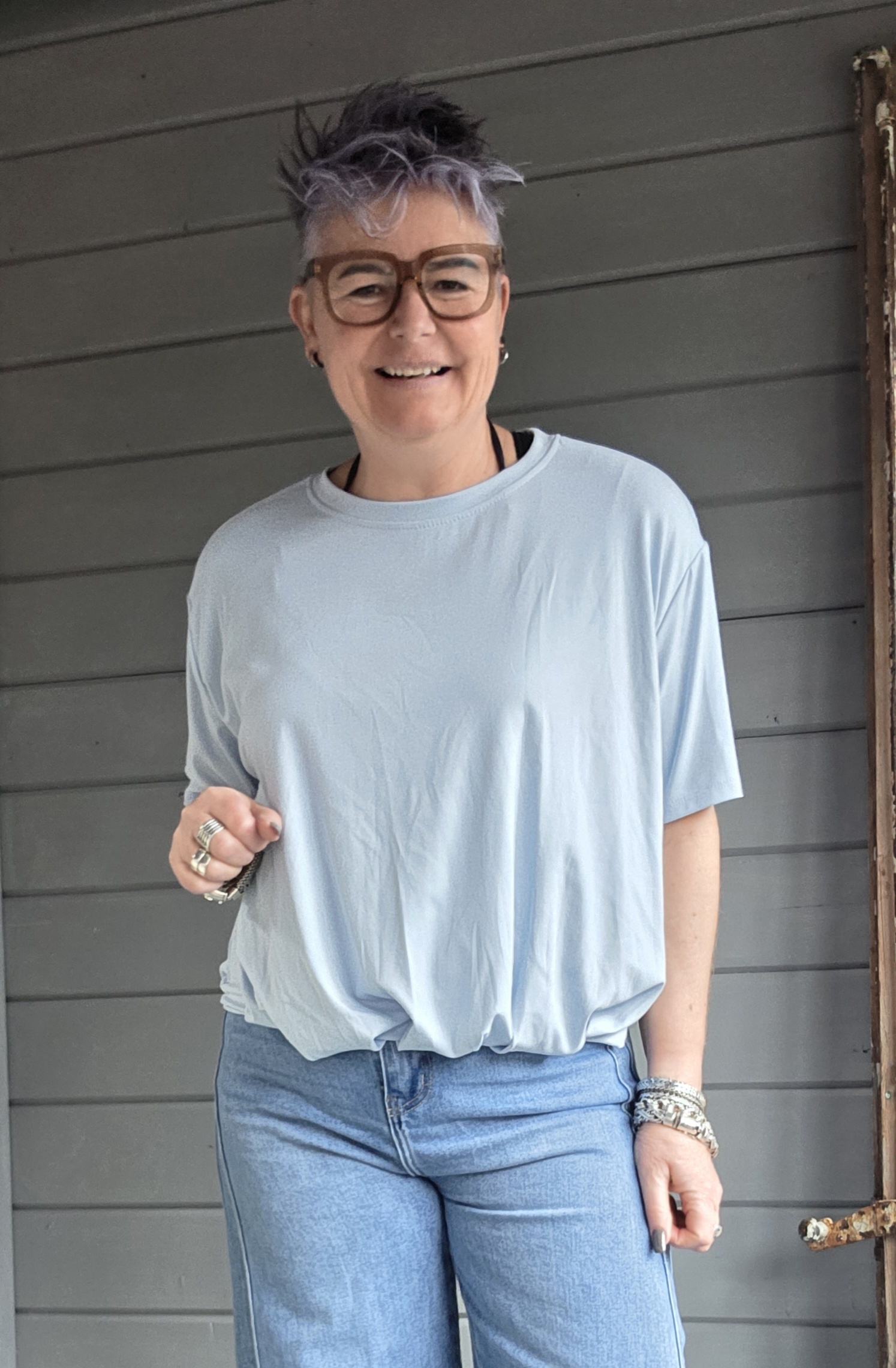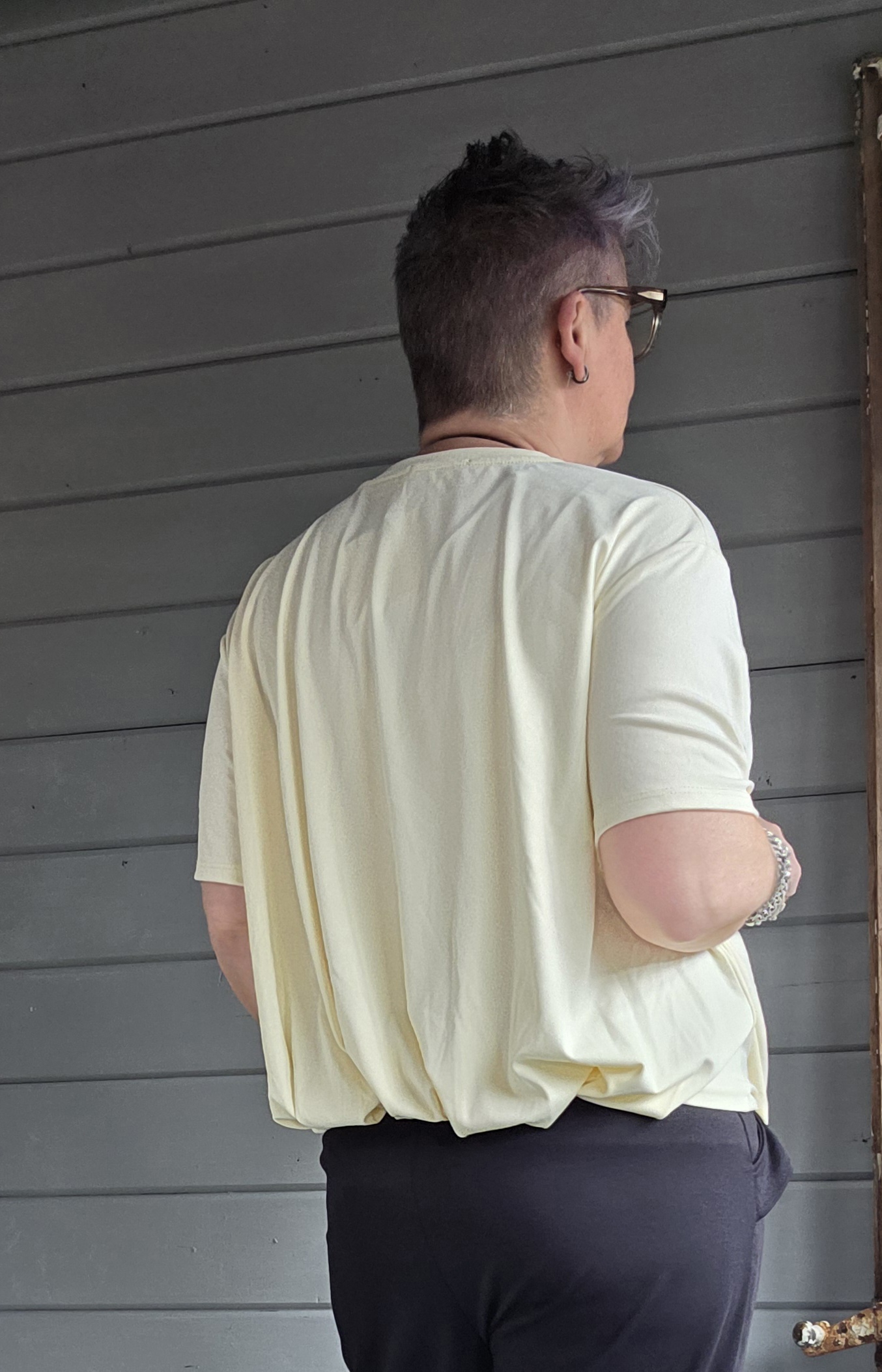 Heeft een bandje en plooitjes onderin, dat zorgt voor een verbloemend effect.