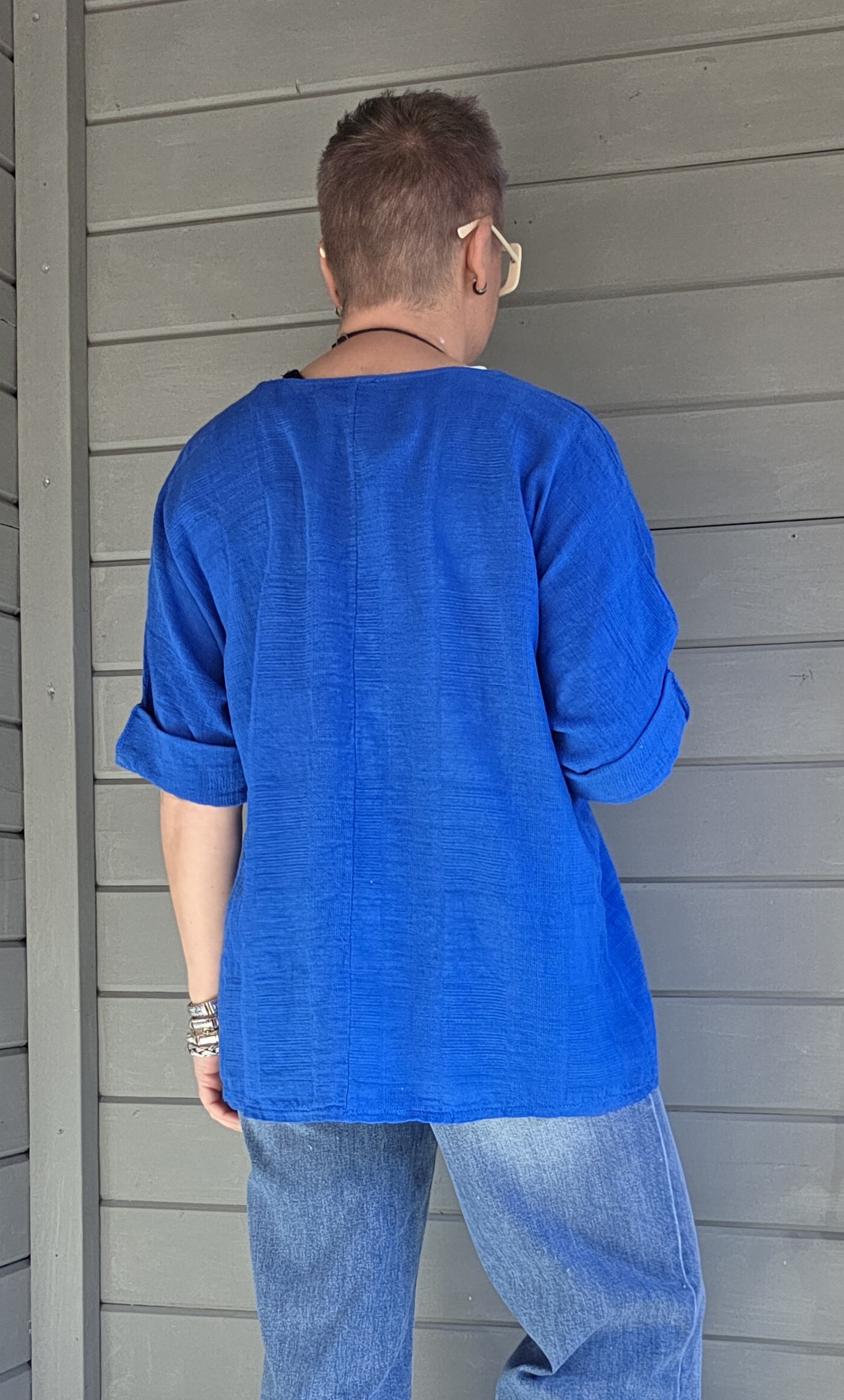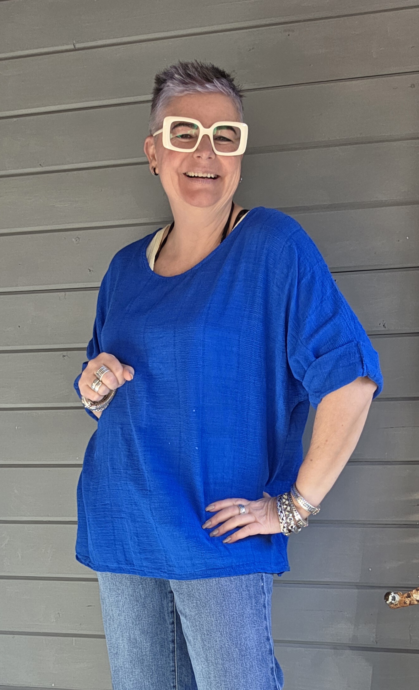 Shirt heeft driekwart mouw afgerold, maar goed op te rollen tot een korte mouw.
