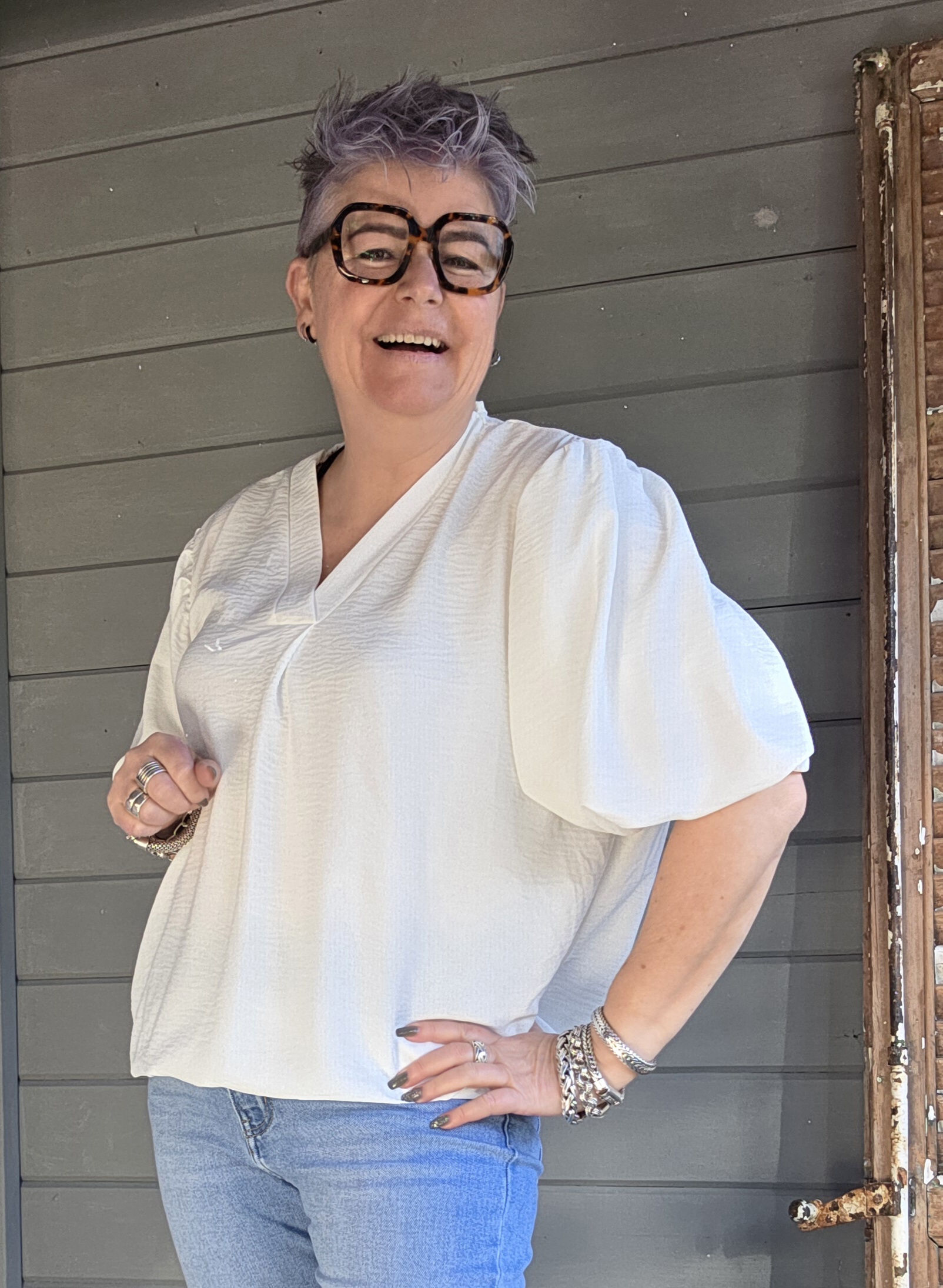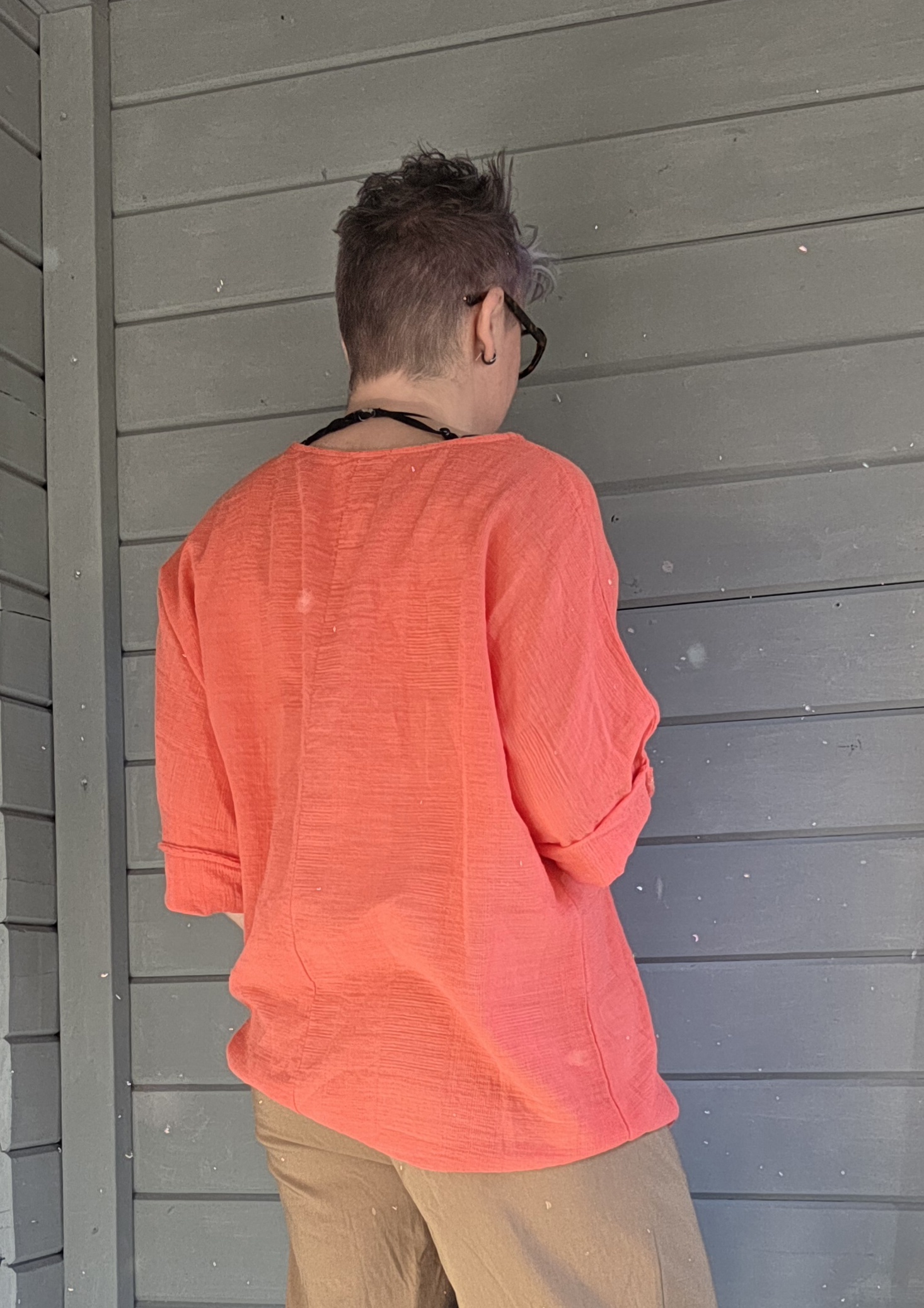 Shirt heeft driekwart mouw afgerold, maar goed op te rollen tot een korte mouw.