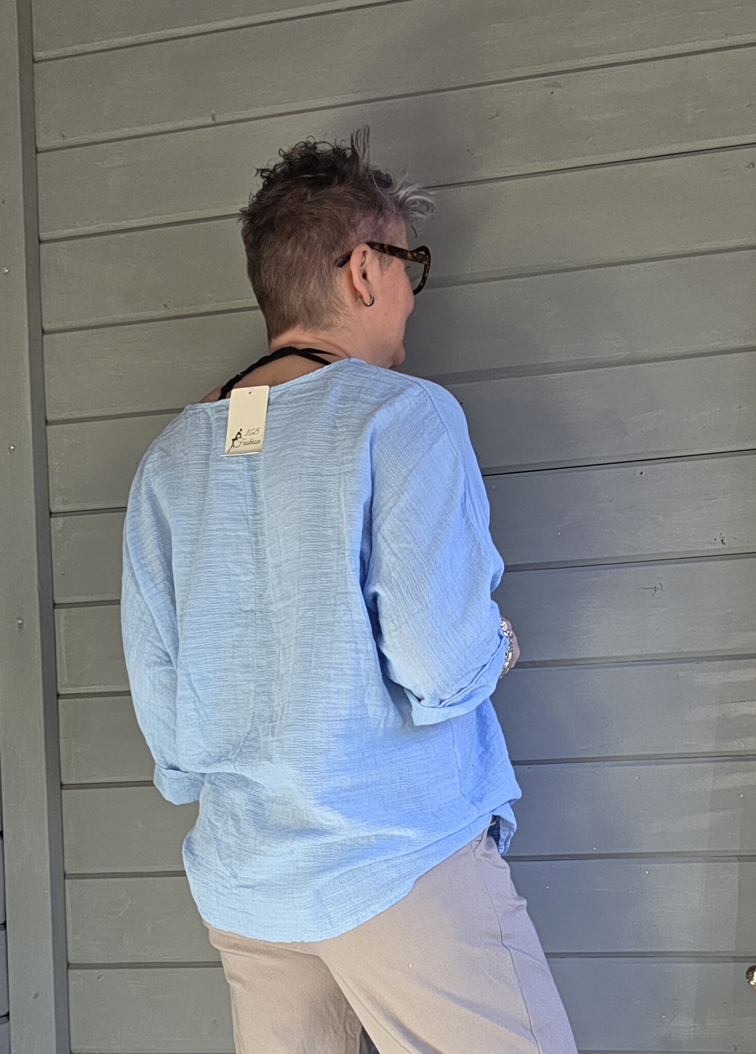 Shirt heeft driekwart mouw afgerold, maar goed op te rollen tot een korte mouw.