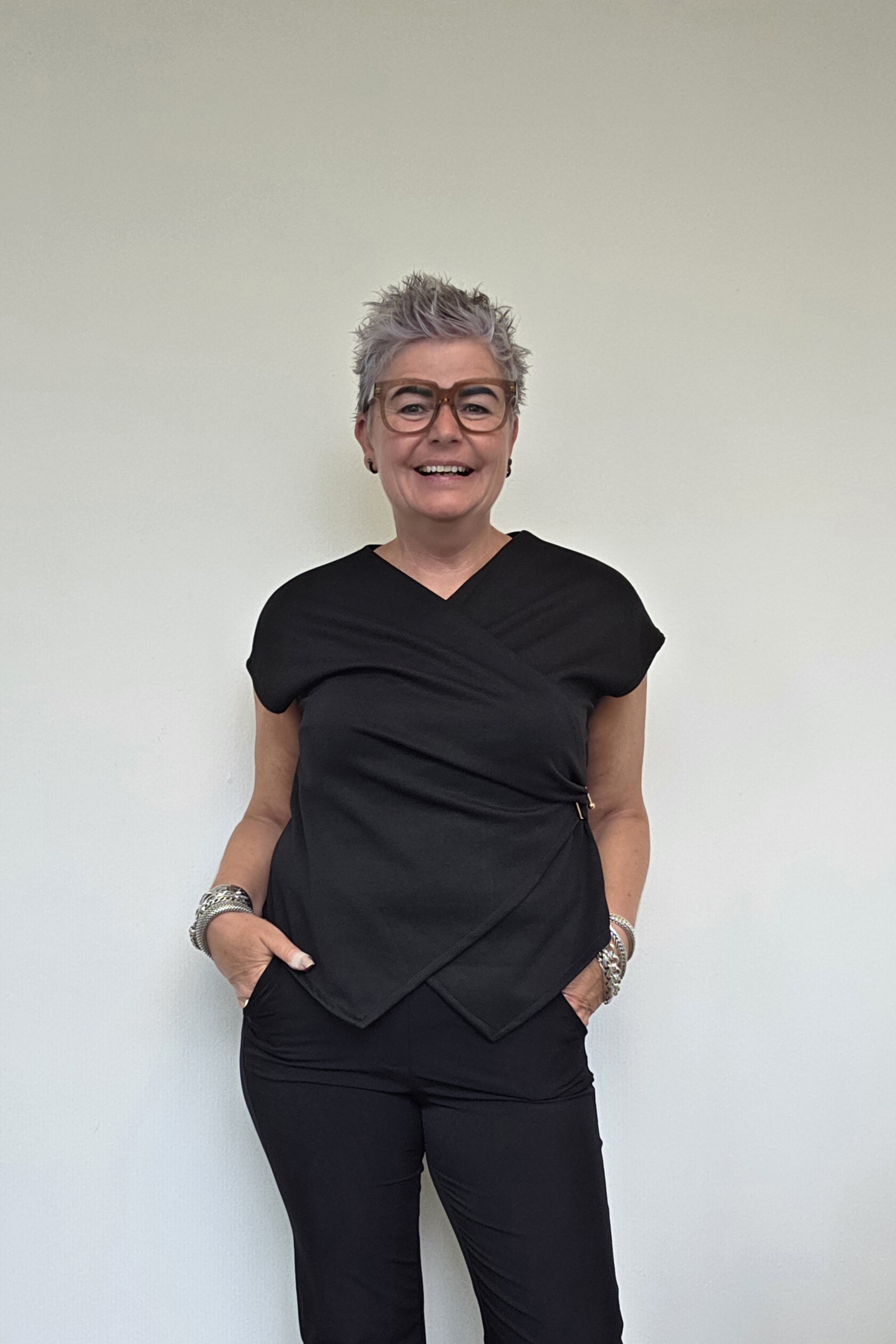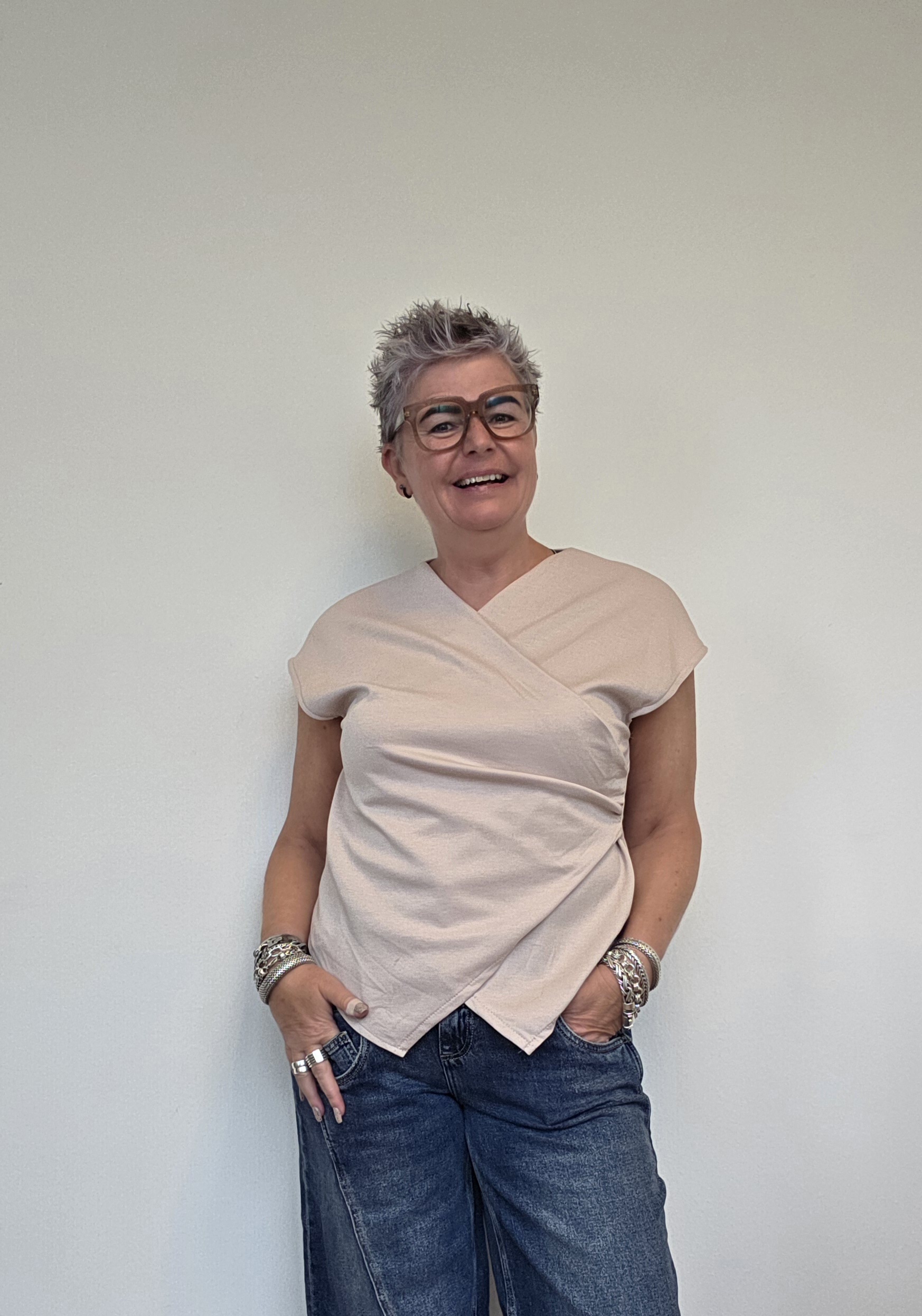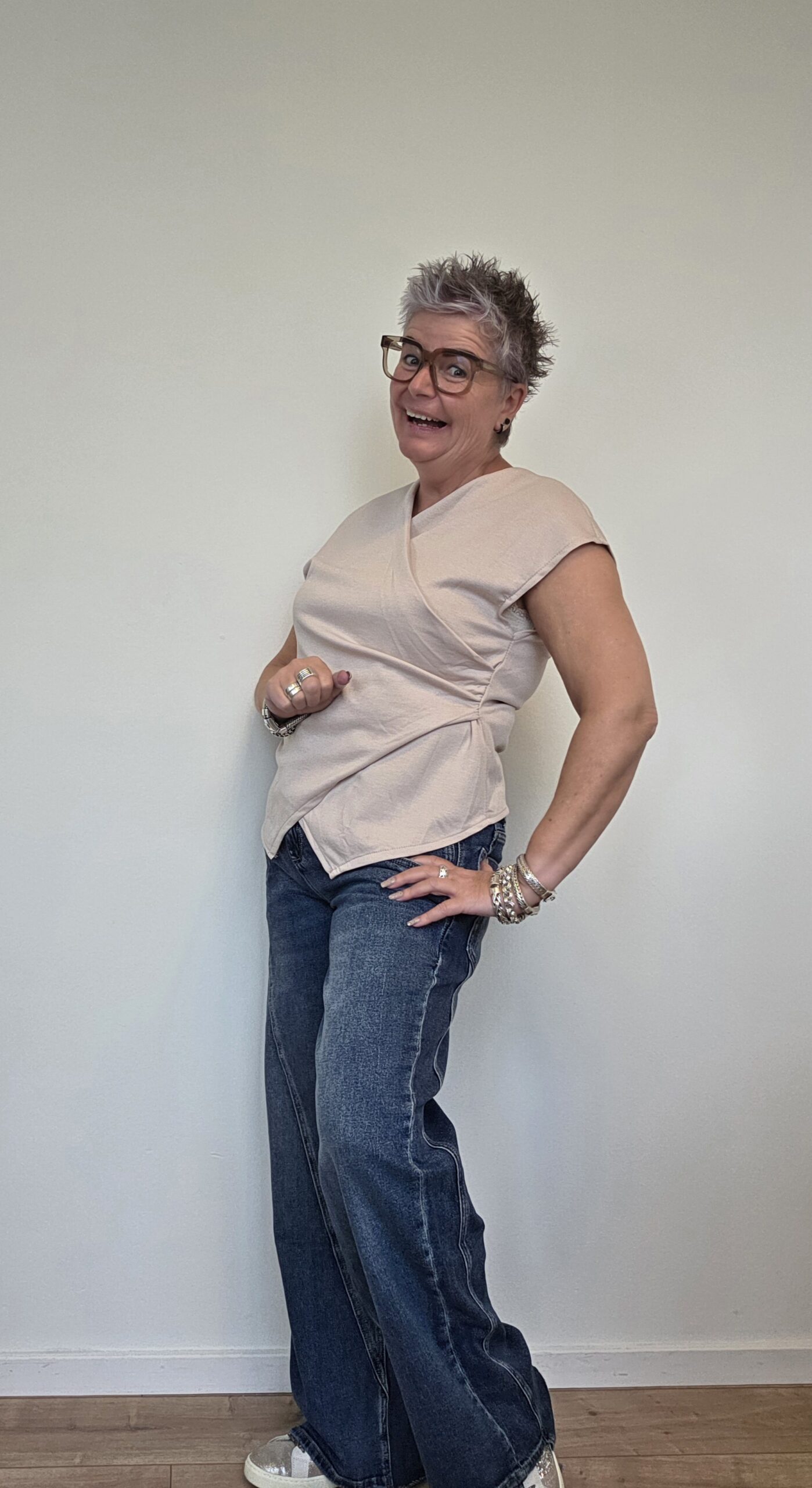 Overslag met als eyecatcher een gouden accessoire die je als je wilt ook kunt weg laten.