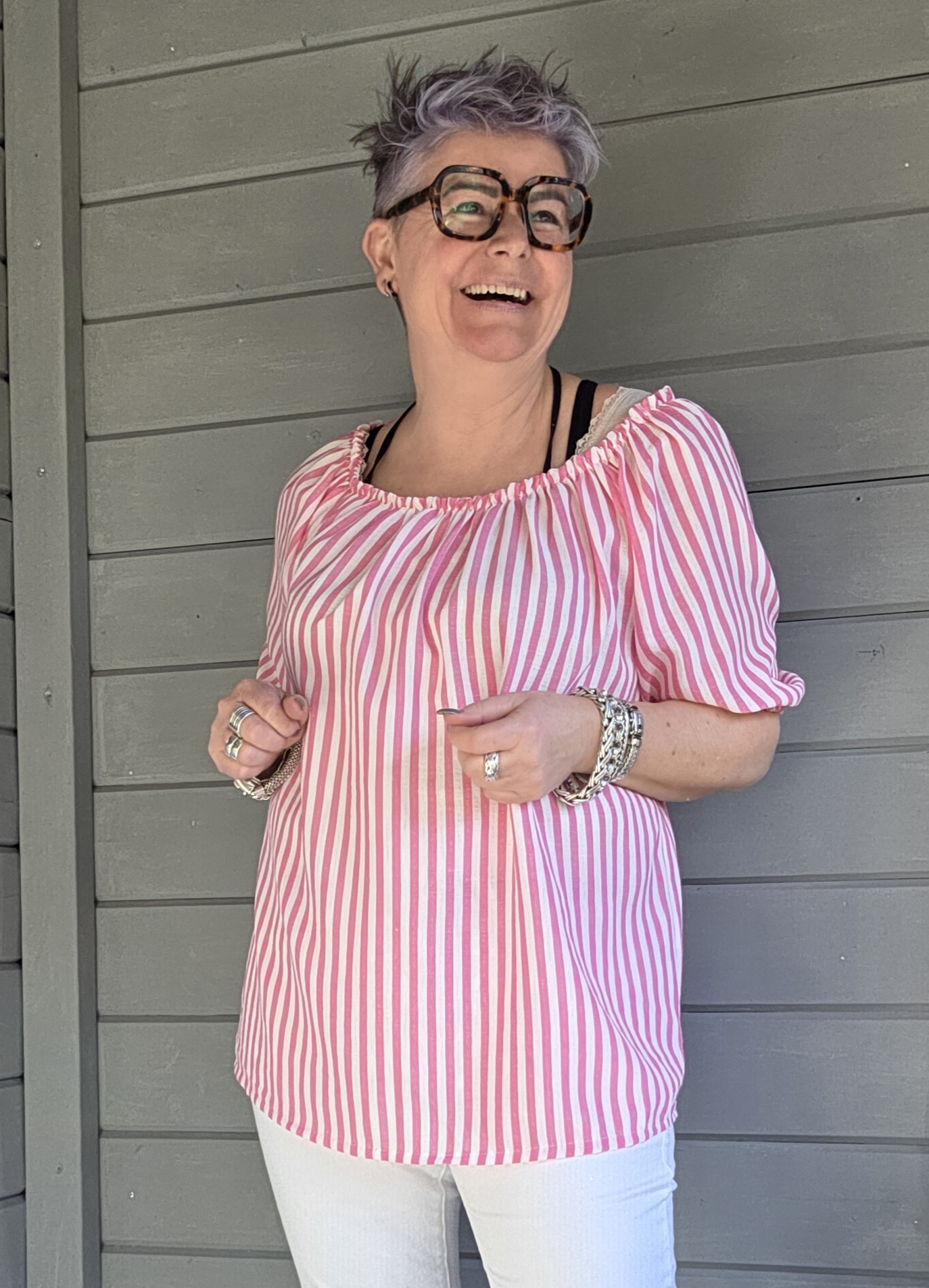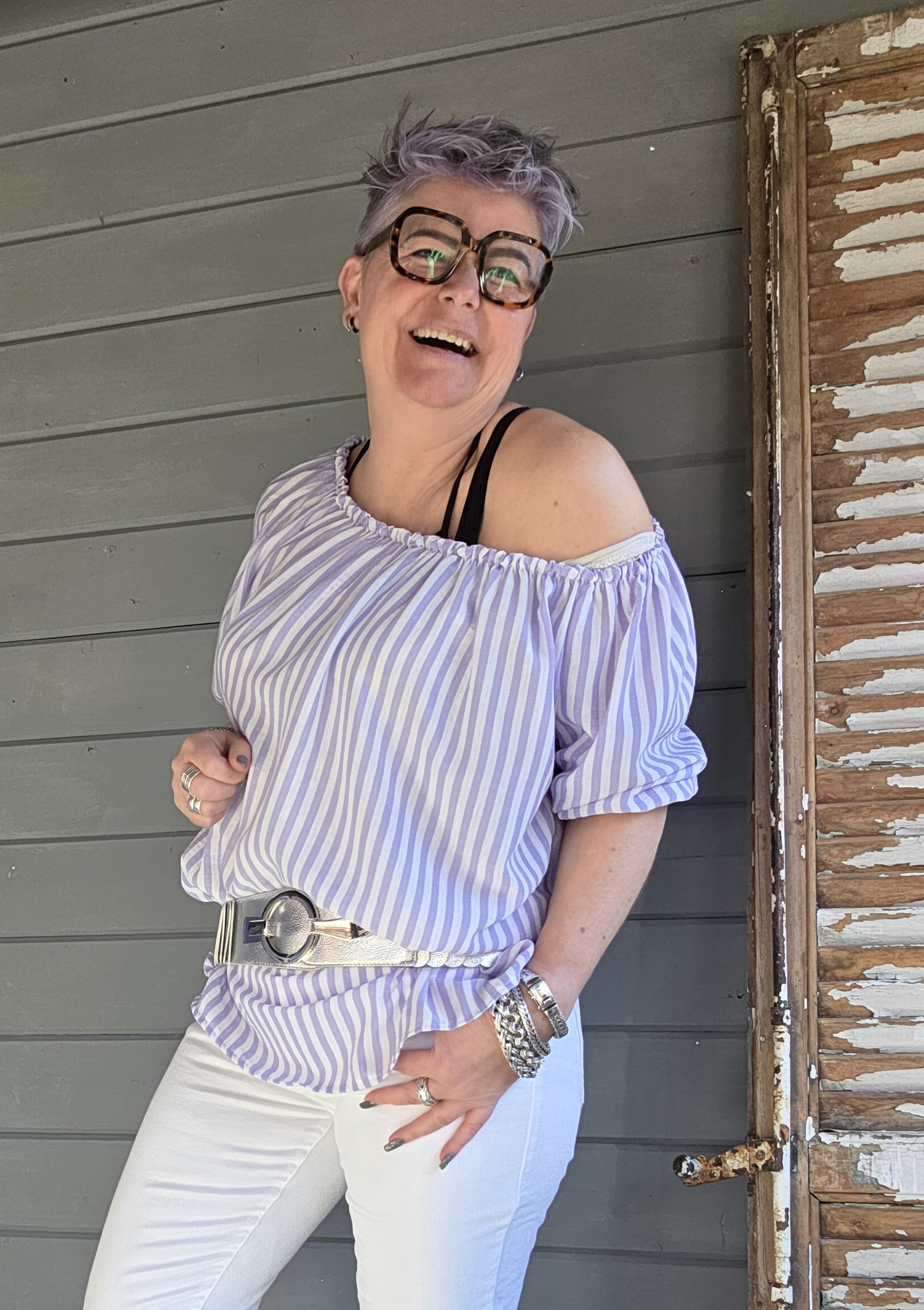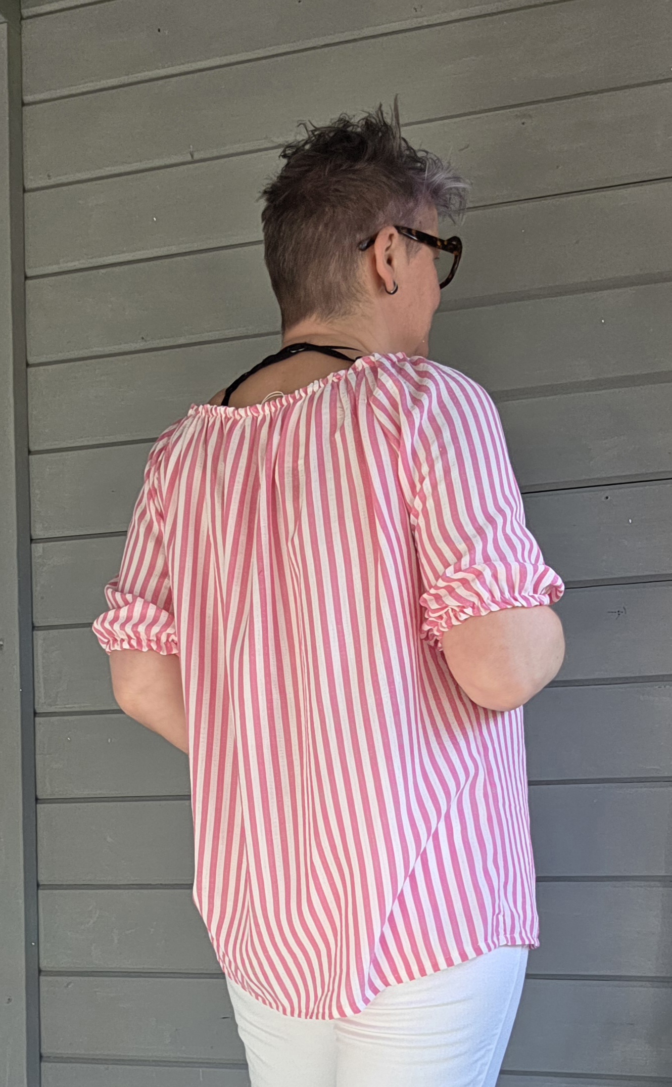 Door een riem erom te doen of bv een puntje door je riemlusje halen, is het shirt ook heel leuk, wat smaller en korter bij maat 38/40