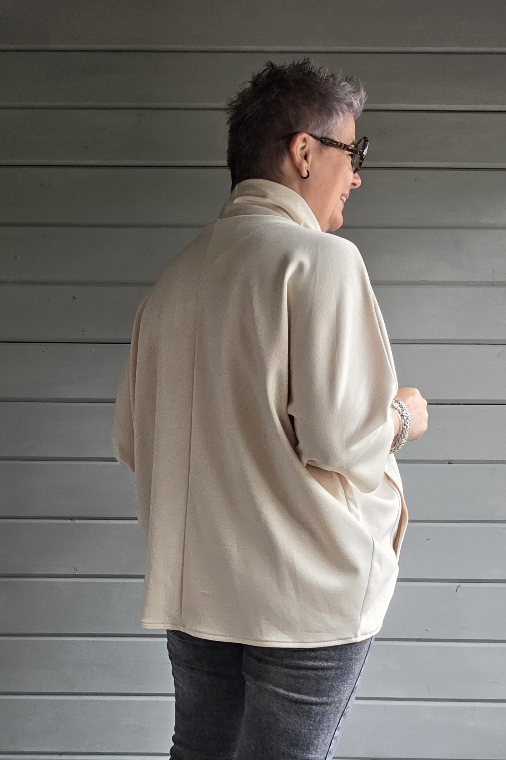 Heeft een opstaande rolkraag, zit niet strak om je nek, zoals een kol
