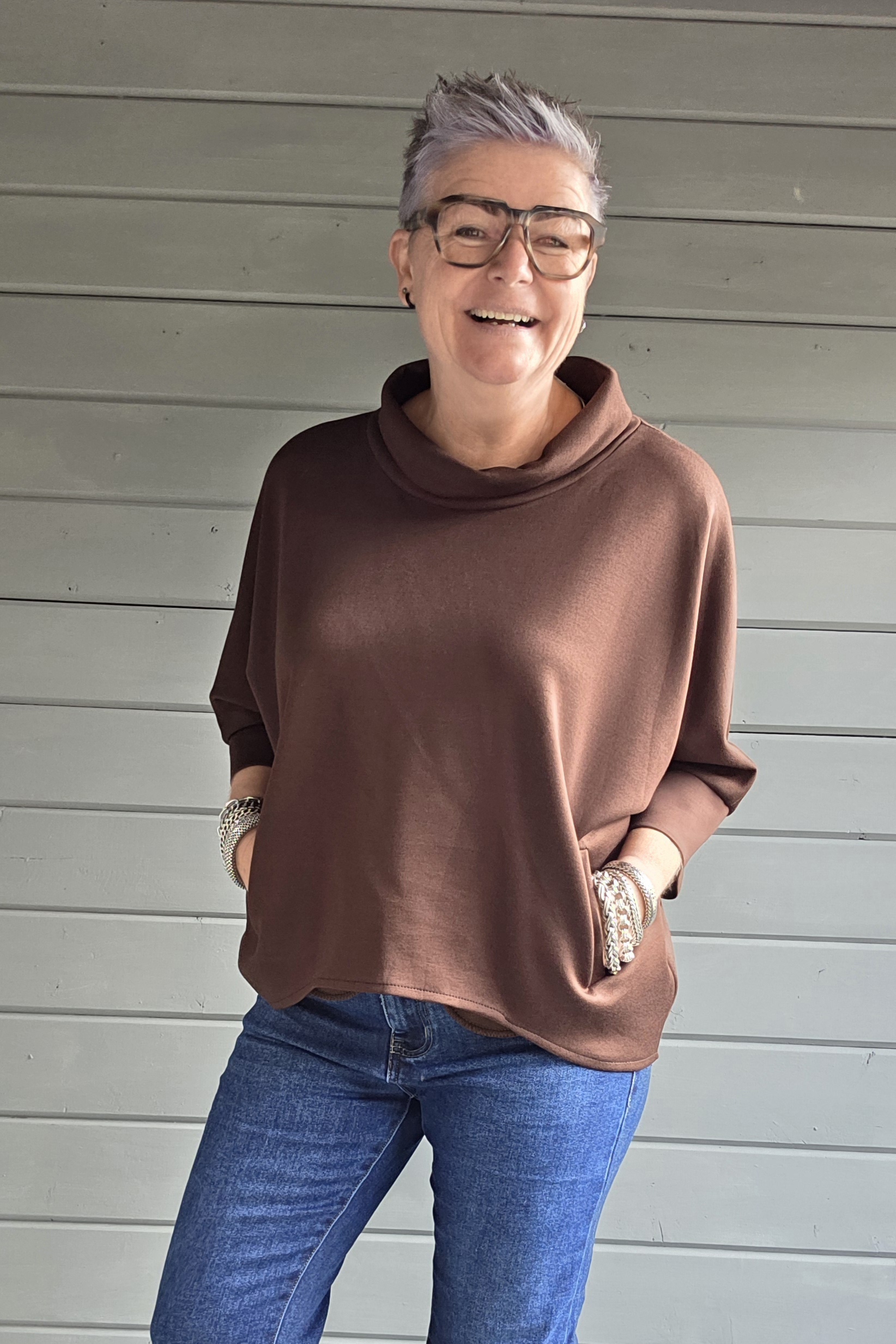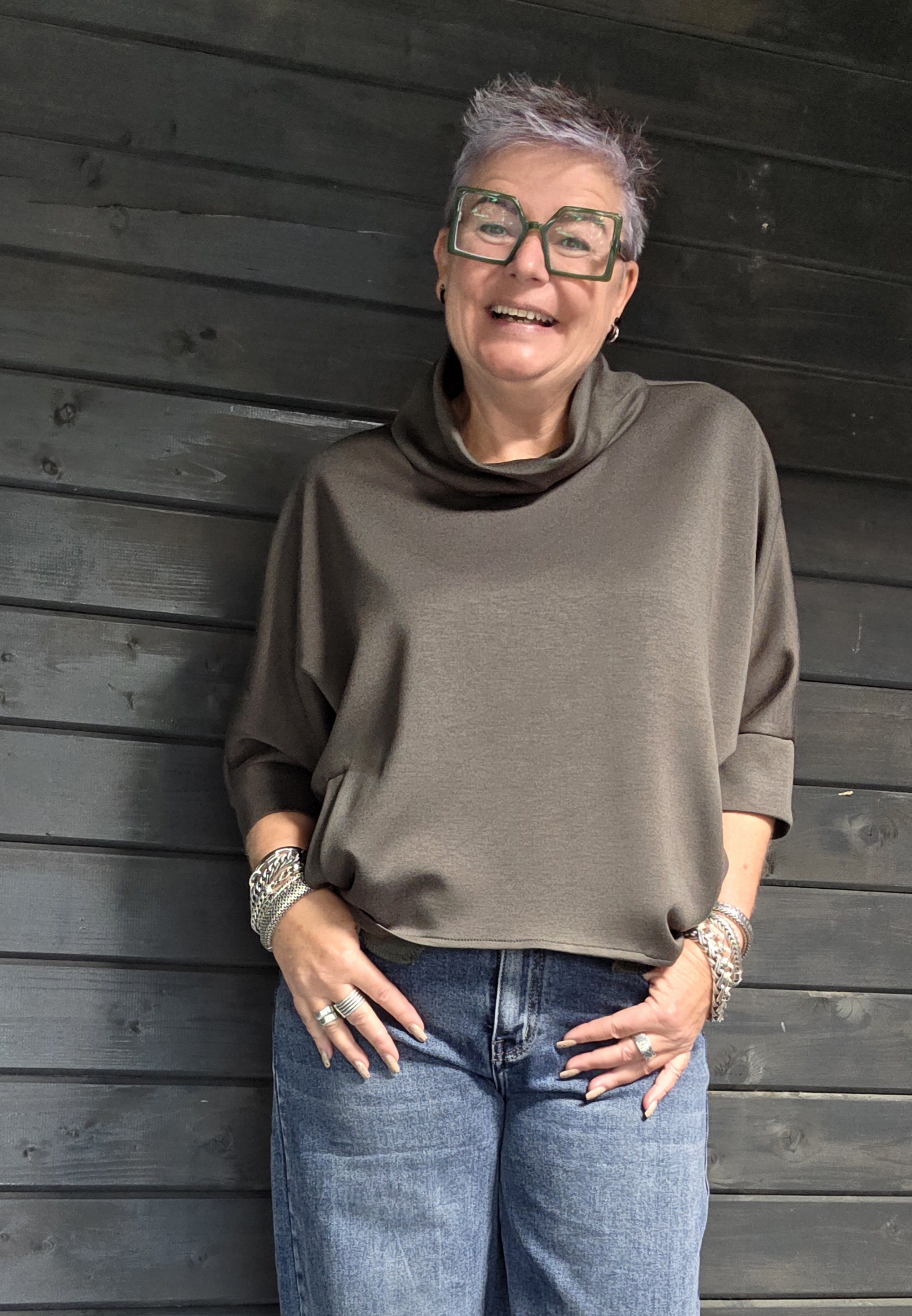 Heeft een opstaande rolkraag, zit niet strak om je nek, zoals een kol