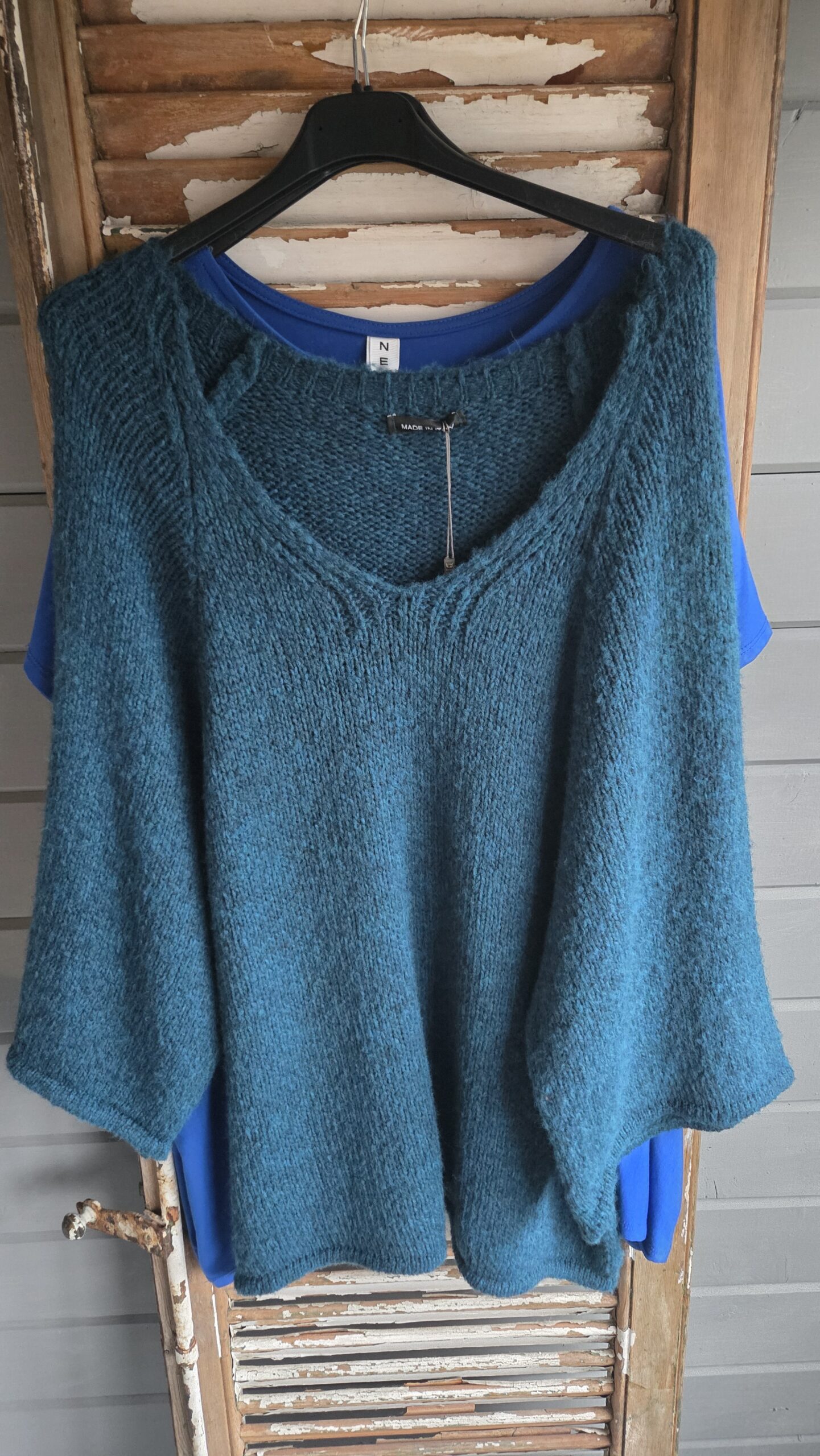 Trui petrol/ vest-jasje gouden broches kunnen eraf zijn nl broches/trui middenbruin
