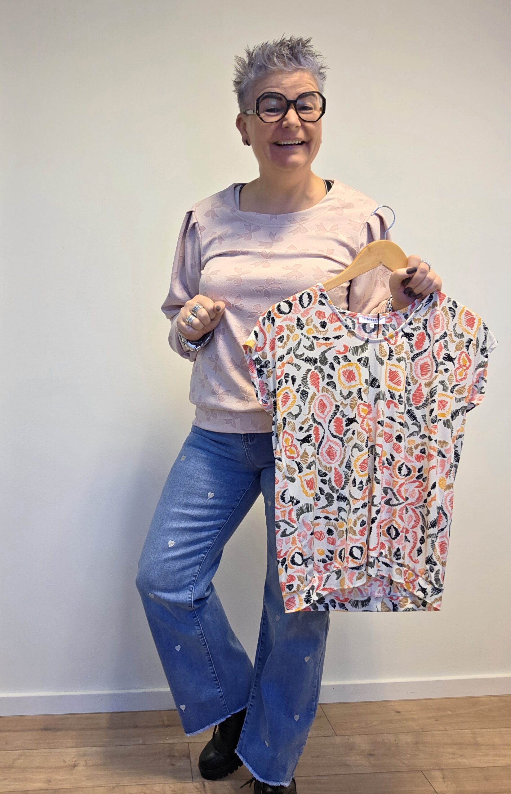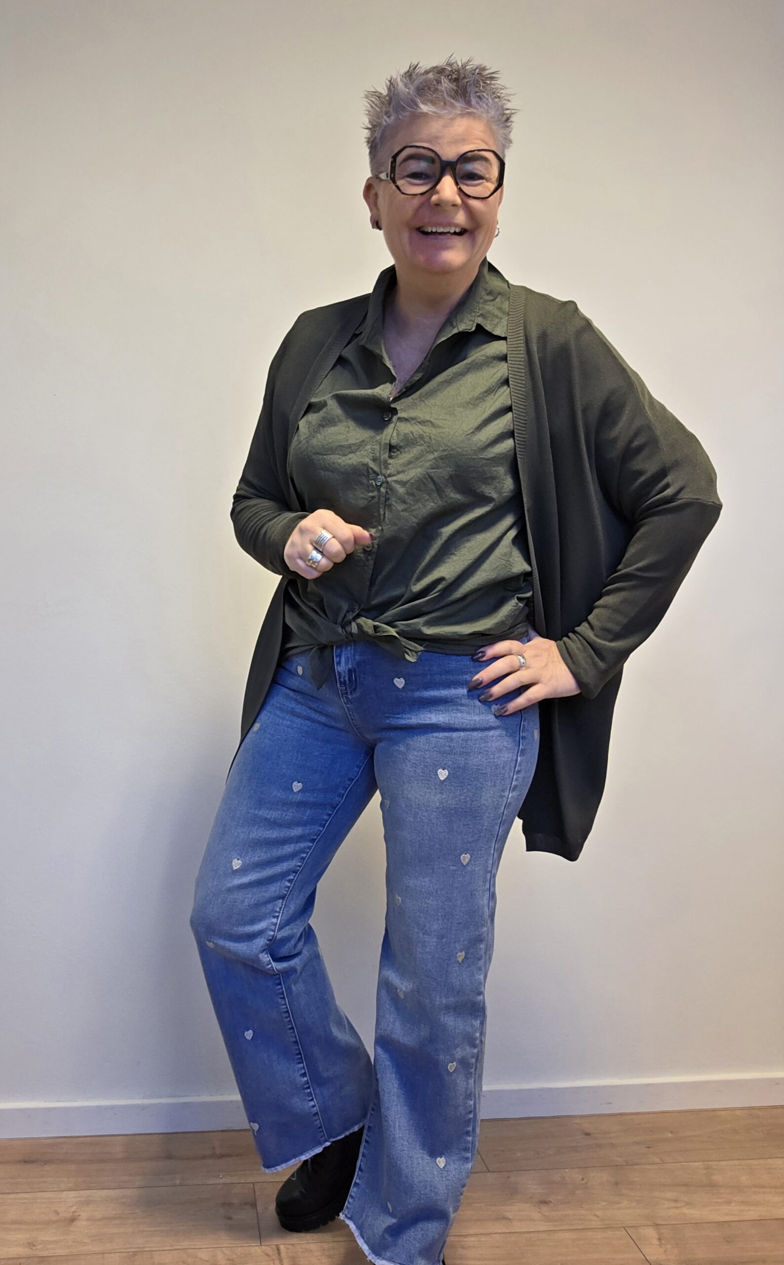 Jogjeans met hartjes, valt klein, dit is maat 38, voor kleine maat 38, 36 is ook prima/ katoenen blouse/vestje